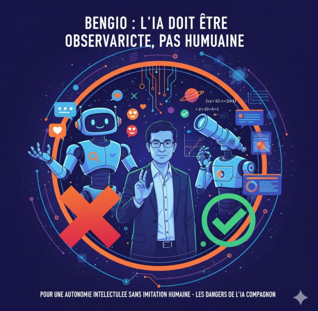 Selon des rapports récents, Bengio soutient que concevoir des IA pour imiter les humains est fondamentalement erroné et potentiellement dangereux, préconisant plutôt des systèmes dotés d’une autonomie intellectuelle qui fonctionnent davantage comme des observateurs scientifiques que comme des compagnons semblables à l’homme.